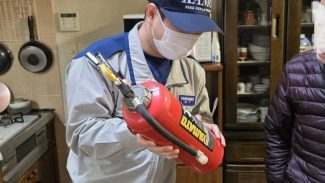 まず「住宅防火対策チェック表」を使って調理器具や暖房器具などの取り扱いなどで防火対策を説明してもらいながら自己診断していただきました。次に火災警報器の動作確認、消火器の使用期限の確認方法などを指導してもらいました。