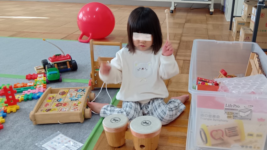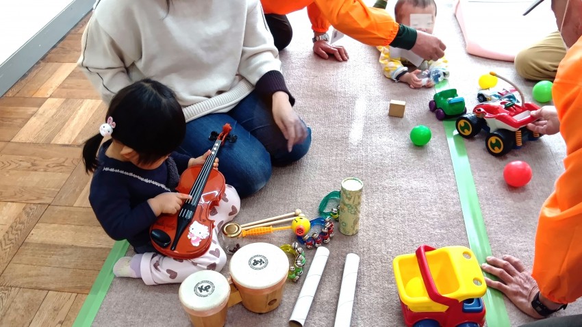 途中からテーマの「音あそび」で音の出る楽器やペットボトルにビー玉を入れて振ったり、ビー玉の入った袋を両手で擦ったり、ラップの芯を使って叩いたりして、自由に音を楽しむことができました。