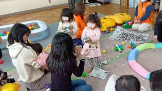 今月は、お天気もよく、風もない穏やかな日でした。5組6人の親子が参加してくれました。初めに、準備しておいた遊具で、いっぱい遊んでもらいました。
