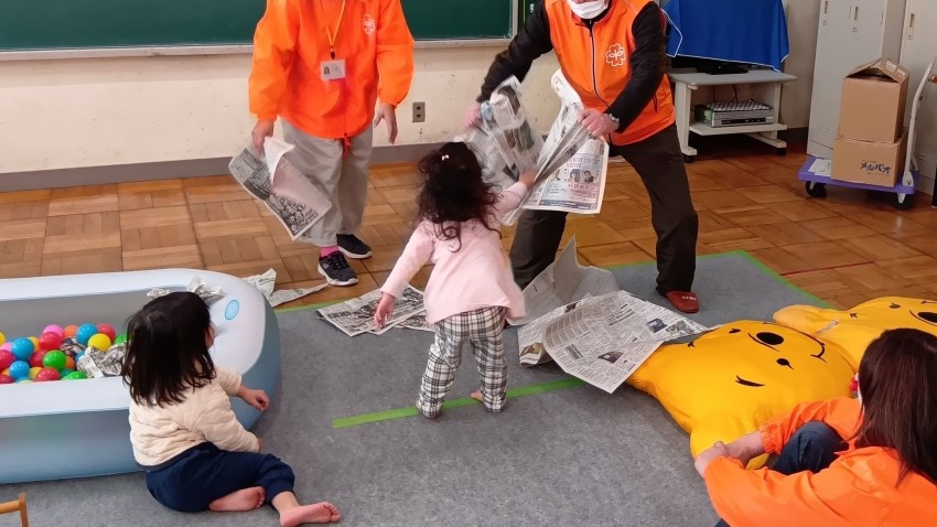 そして次に、今回は「新聞あそび」をしました。新聞紙をちぎったり、新聞紙を丸めて玉を作ったり、グーパンチでやぶったりしました。又、ちぎった新聞紙を細かくし、紙ふぶきにして遊びました。