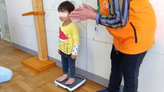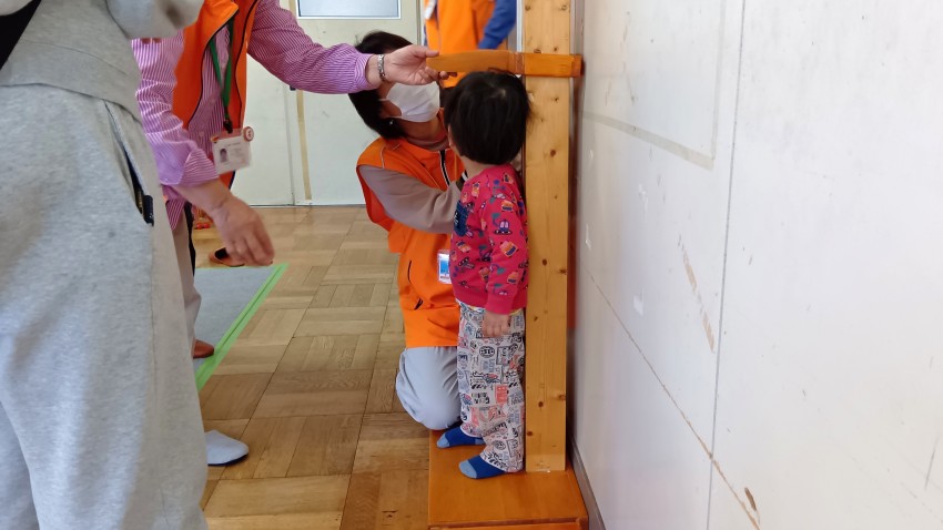 始めは、いつもと同じように準備しておいた遊具でいっぱい遊んでもらいました。合間に、発育測定(身長・体重)も行いました。