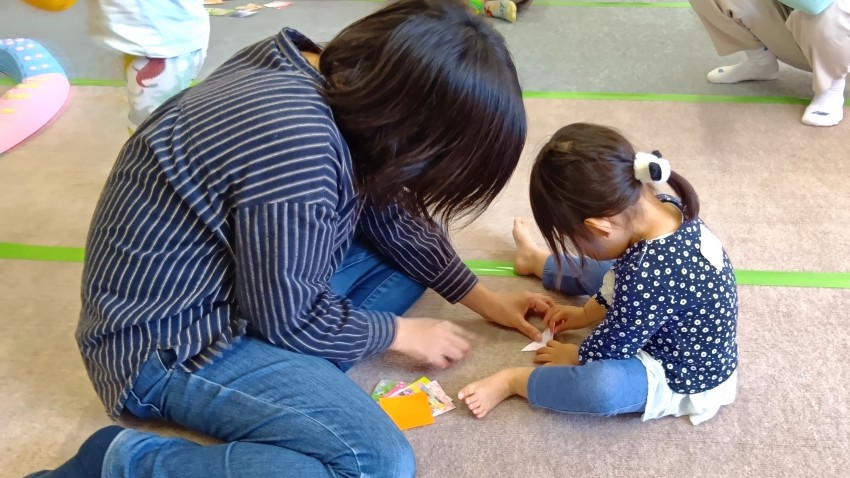 子どもが落ち着いたところで、お母さん方には、おしゃべりサロンとしてコーヒータイムを作り、談笑してもらいました。帰りには、8枚の色紙も入れたお菓子のプレゼントも行い、親子共々、楽しい時間を過ごしてもらいました。